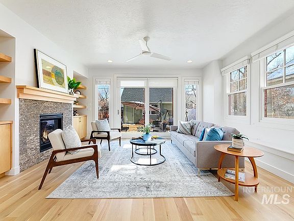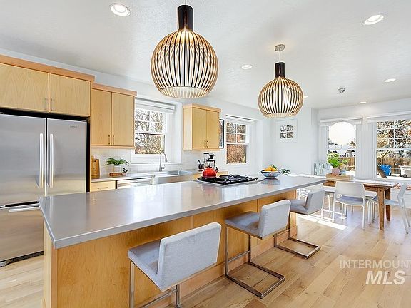 A custom-built Modern Craftsman set on a dreamy tree-lined street in the core of the North End! Designed and constructed by Syringa Homes, this ~3700sf home features exceptional build quality and an architectural design that perfectly blends with the historic properties in the neighborhood. Located a stone's throw to Elm Grove Park, Boise's best attractions are within blocks of the darling front porch, including hiking and biking trails, Hyde Park, desirable schools, and downtown. The interior favors abundant natural light, clean lines, and a neutral palette of soft whites, while beautiful wide plank flooring provides visual weight throughout. The kitchen features sleek wood cabinetry, stainless-steel appliances, and a long entertaining island crowned by stunning handmade wood pendants from Finland. The main level primary suite feels like a retreat with an east-facing orientation soaking in the morning light, direct patio access, and a spa-style en suite bathroom.