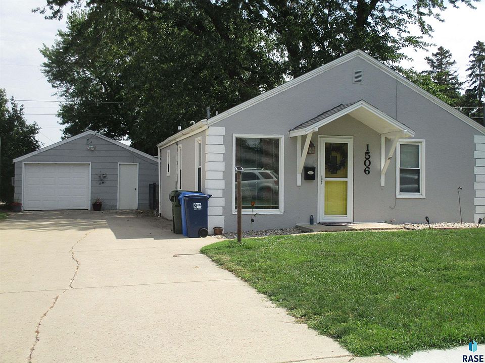 Cute Bungalow with everything on 1 level. Updated vinyl windows, electrical, new overhead garage door, and new water heater in 2022. 2 bedrooms and 1 full bath. Main floor laundry. Oversized single garage with 2 additional storage sheds, and concrete patio. Yard is fenced and has nice big shade tree. Plenty of room for dogs, kids, and/or garden. All the appliances are included. Close to Denny Sanford Premier Center, interstates, and other attractions.