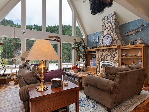 Western Montana Home on the banks of the Clark Fork, a world-class fly-fishing mecca, within an upscale neighborhood with 11 acres of open space! Inside is spacious, yet a cozy private retreat feel with your own personal river view from 24' windows, and a towering river rock fireplace with built-ins. Views carry through the main level to the high-end chefs kitchen with breakfast bar and tons of storage, then into a huge rec room perfect for relaxation and additional living space. Don't miss the master suite with private deck access, riverfront views, and a great en suite with walk-in closet. Upstairs offers tons of additional storage, two more spacious bedrooms and large bathroom to share. Other amazing features of the home include an office space, home theater, and beautiful solid wood do