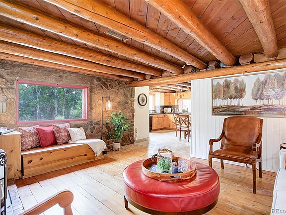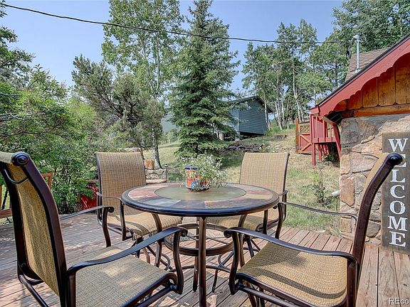 This captivating house nestled in the serene mountain setting on approximately 0.66 acres exudes rustic charm and inviting warmth. The home's 2+ bedrooms, 1 bath layout has approximately 1,182 square feet. Inside, one is greeted by the home's distinctive character, featuring log ceilings in the kitchen and living room that seamlessly blend rustic elements with modern comforts. The remodeled kitchen and bathroom showcase updated amenities, while the fireplace and pellet stove provide additional sources of warmth throughout. Enjoy the tranquility of the quiet outdoors on the large deck, with pleasant views and abundant wildlife. The circular driveway provides convenient parking for multiple vehicles, and the property's close proximity to Evergreen Parkway and the Buchanan Rec Center, nearby shops and restaurants, as well as the Beaver Brook Watershed Trailhead, offers a prime location within the vibrant Evergreen community. With its charming character, well-appointed features, and idyllic setting, this property presents an exceptional opportunity to experience the beauty and serenity of the Evergreen area in a sweet and desirable neighborhood.