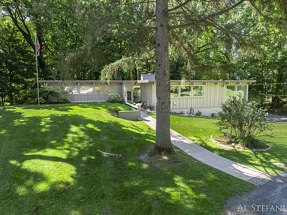 Nestled on a tranquil 3.5-acre wooded lot, this stunning Mid-Century Modern home boasts sought-after architectural details and recent enhancements both inside and out. Featuring newer cabinets, quartz countertops, and stainless appliances, the kitchen's original blue-tile backsplash and large windows create a bright, inviting atmosphere.