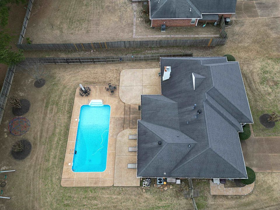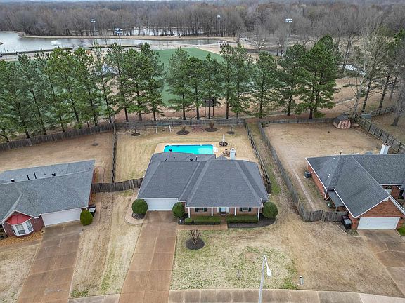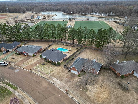 Gorgeous 3 bedroom/2 bath home in Collierville that backs up to Johnson Park! This home feats. in ground pool: liner, motor & pump NEW in 2022 ~ Living room w/ vaulted ceiling & brick fireplace ~ Eat-in Kitchen w/ great cabinet & counter space ~ Separate Dining Room ~ Main bedroom w/ vaulted ceiling, full bath feat. green marble jetted tub & counter tops, double sinks, & separate shower ~ Bedrooms 2 & 3 share a full bath ~ Covered screened porch in back, large fenced yard w/ large patio areas!