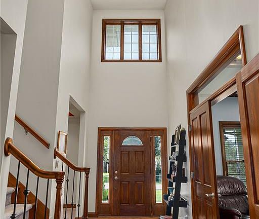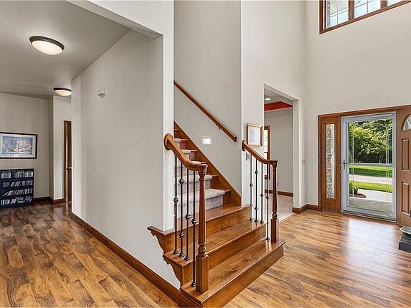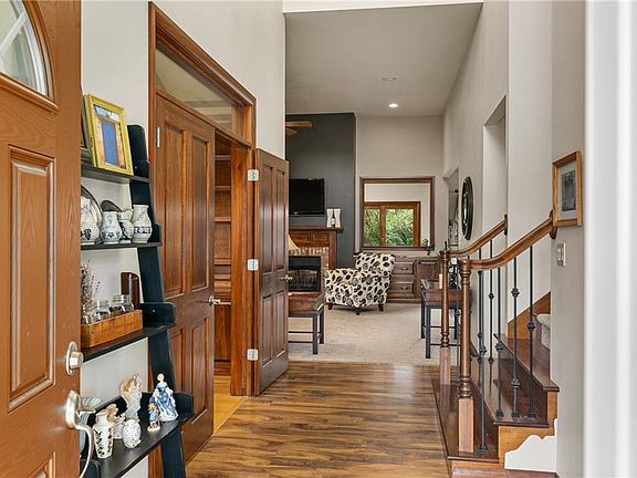 A Fine Home Indeed! Check out this beautiful home featuring 5 bedrooms, 4.5 baths, a Main Floor Master, and Main Floor Laundry! From the inviting front porch, into the two story entryway, to the dining room with trey ceiling, to the office complete with built-ins, to the open living room with 12' ceiling and two sided wood-burning fireplace, open to the kitchen with granite counter tops and stainless appliances, and a pantry too! To the sunroom that overlooks the backyard deck and soothing sounds of the water feature. Upstairs you will find 3 nice bedrooms, one with its own full bath, another full bathroom, and a craft/playroom. The basement features a wide open space that consists of a family room with gas fireplace, lots of room for play, a Wet Bar, a bedroom with egress window, bathroom, exercise room, and storage. 3 car garage PLUS a 30x40 Insulated Detached Garage with heater! Lots of Green Grass and Trees makes this a One-Of-A-Kind Property located in a Fantastic Neighborhood!