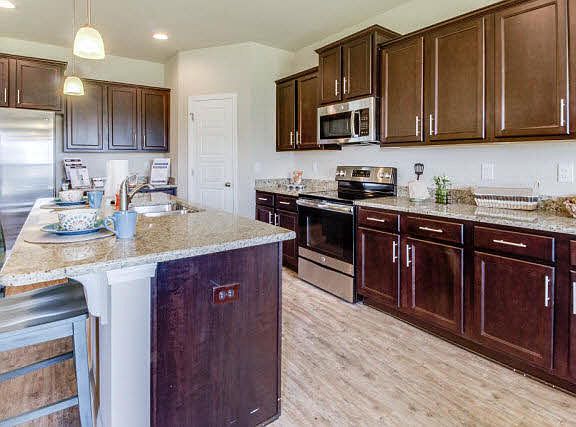 The KADEN D - This majestic, open plan featuring 5 bedrooms & 3 baths, will be move-in ready by the end of October 2017! This split plan has a large master bedroom w/ double trey ceilings & crown molding, a huge master bath w/ 5 ft. shower & separate soaking tub, double vanities with granite, & his-n-her walk-in closets and separate linen closet. Kitchen features large island overlooking family room, stained cabinetry, 3cm granite counters and stainless appliances. Massive family room with woodburning fireplace, soaring double trey ceilings w/ crown molding provides great gathering space for the family. DR Horton build to GOLD FORTIFIED standards. Note: Photos are of similar home, not actual home.