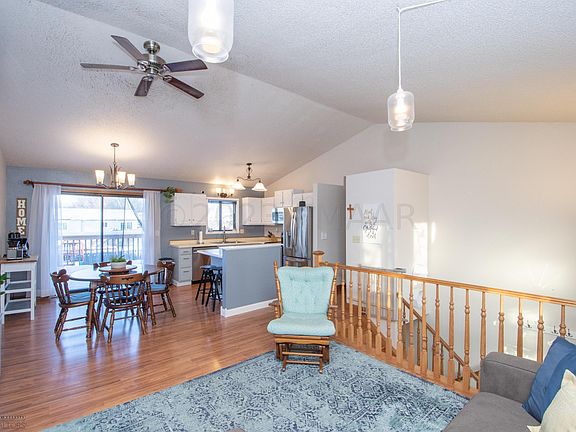 Great South Fargo single family home. Unique feature including two walk outs. Upper level deck walk out and lower level patio walk out. Four total bedrooms with three on the upper level. Upper level also has updated kitchen with white cabinets and stainless steel appliances, dining room and full bathroom. Lower level has fourth bedroom, family room, bathroom, laundry room and storage. Large fully fenced yard with storage shed and playset. Nice established neighborhood with mature trees. LOW specials too!
