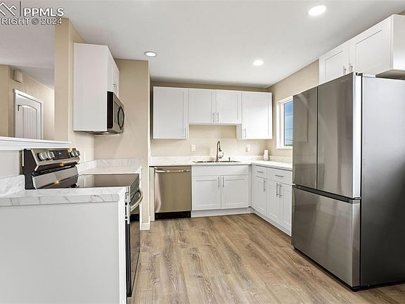 Welcome Home! This beautifully remodeled gem nestled in the Stratmoor Valley neighborhood offers modern elegance paired with the comfort of a well established community in south Colorado Springs. Fall in love with stunning new luxury vinyl through much of the upper level of the home. In combination with incredible mountain views, a brand new kitchen with abundant storage, cooking space, and new stainless appliances this house is one you're going to want to show off. Fresh paint, a fully refinished primary bedroom as well as a guest bedroom or office space ensure a peaceful living experience with the addition of being able to entertain friends and family. As you move to the lower level of the home you'll discover the same high-quality craftsmanship that defines this remodel. New carpets, trim, and paint create a cozy atmosphere while the remodeled bathroom offers convenience with a contemporary design. This level features a second functional living area along with an updated laundry facility, two additional refurnished bedrooms, and the ability to walk out to your spacious backyard. Located just minutes from I-25, Fort Carson, and all of the dining and entertainment options of southern Colorado Springs, this home is ready for you. Don't miss the opportunity to take advantage of this amazing home!