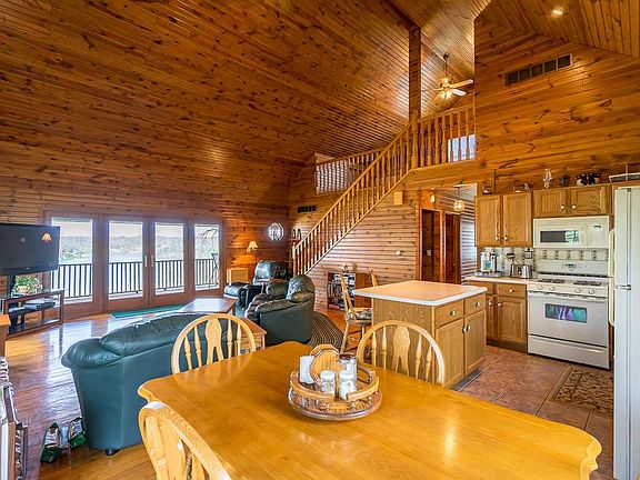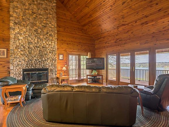 Unbelievable lake views! Soaring ceilings, beautiful woodwork, wrap around deck, walking distance to the main beach, this house has it all! A bedroom on every floor, 3rd bedroom is a loft that overlooks a grand stone fireplace. Open concept living, kitchen and dining on the main floor with vaulted ceilings and stunning lake views. The lower level has a bedroom and full bath with family room that walks out to a level lot. You cant beat the location and views from this unique offshore property with an onshore feel.