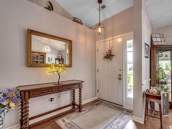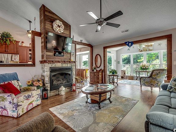 Beautiful home situated on large pond/lake and located in a cul de sac. This 3 bedroom home has an open floor plan, with Carolina room that has floor to ceiling windows which brings the outside into your home! Kitchen has stainless steel appliances with farm sink and level height dishwasher! Spacious living room with fireplace. Large primary bedroom suite with barn door going into the ensuite which has been updated with tile shower. Roof is only 4 years old. All new windows and guest bath has new tile shower 4 years ago. Enjoy entertaining in your backyard with very large patio, fenced in area which owner uses for their pets with astro turf and new deck which overlooks the large pond/lake. Very well-maintained home just 2 miles to the beach! Amenities include community pool and common area with large lake/pond!
