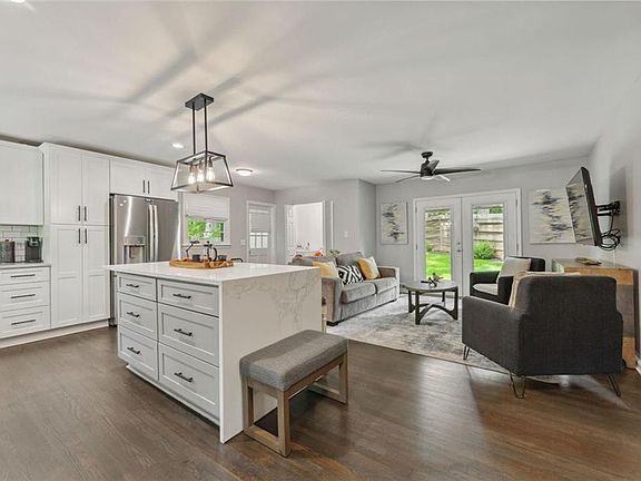 - Features: Kitchen Island, View to Family Room, Cabinets White, Solid Surface Counters