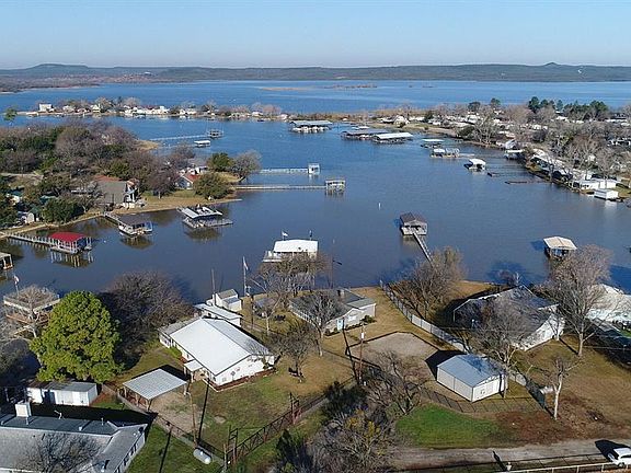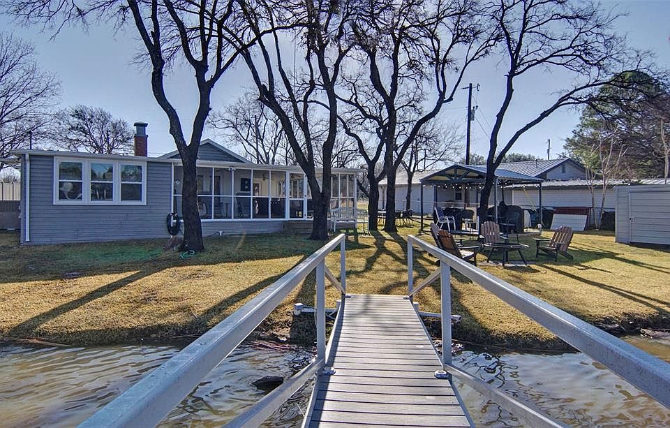 Comfortable elegance with a cool vibe! Once you enter this completely remodeled, DEEDED waterfront lake home all your worries will disappear. Comes completely turn key, furnished and ready to enjoy. Beautifully constructed new 576 sq ft fabulous Bunkhouse sleeps 8-10 easily. New steel pergola w electricity, ceiling fan, outdoor lighting, gas grill, gas griddle and pit boss smoker. The screened-in porch facing the lake will be a favorite for friends and family to gather. Recent roof, new paint, HVAC, professionally installed 4k TV's and electronics and more. You won't find a better setting to enjoy the best sunsets on Possum Kingdom Lake. Two slip dock with lifts complete it all. The time is now this won't last!