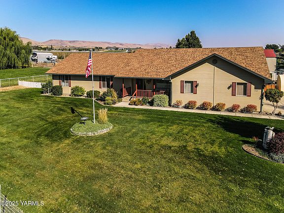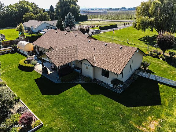 Welcome to this perfectly maintained 1,878 sq ft home situated on 2.51 irrigated acres with senior water rights. Inside you will find newer hardwood flooring throughout, premium top-to-bottom blinds designed to maximize natural light and views while reducing heat and glare, and a floor plan cared for down to the finest detail. The kitchen, dining, and living spaces flow comfortably for both everyday living and entertaining.The exterior of the property reflects years of care and pride, with custom landscaping thoughtfully designed and carefully maintained. The yard surrounding the home is equipped with underground sprinklers, while the pastures feature irrigation lines for efficient watering. Additional highlights include a large shop with a built-in loft, small animal barn, chicken coop, hay storage, and multiple functional outbuildings that maximize use of the acreage. Mature trees and the surrounding hop fields create a sense of privacy and seclusion, making this property feel like a true oasis while still offering convenience to nearby amenities.