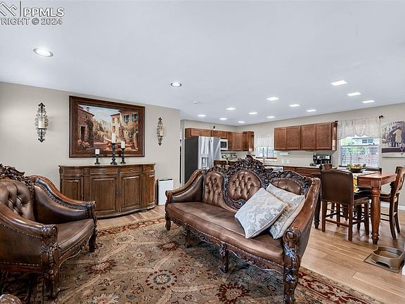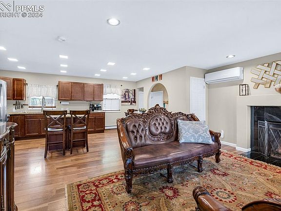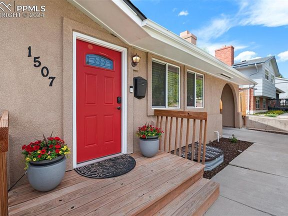 Stunning ranch home in Pikes Peak Park! This meticulously updated property boasts impressive curb appeal with its stucco exterior and inviting vibrant red door. Step inside to discover an open-concept living space where the living, dining, and kitchen areas seamlessly flow together. Wood laminate flooring graces the floors, complemented by abundant recessed lighting that creates a cozy ambiance. Gather around the wood-burning fireplace in the living room, perfect for those chilly Colorado evenings. The spacious kitchen hosts granite countertops, stainless steel appliances — including a gas range — plus an island for additional workspace. Whether preparing gourmet meals or hosting casual get-togethers, this kitchen is sure to impress. On the main level, you'll find two generously sized bedrooms, including a large primary suite complete with an ensuite bathroom for added convenience. Venture downstairs to the fully finished basement, where a large family room awaits, offering endless possibilities for entertainment and relaxation. Two conforming bedrooms, a bathroom, and a laundry room with stackable washer and dryer and cabinetry complete the lower level. The breathtaking backyard oasis is shaded by mature trees and features a large patio area — ideal for al fresco dining or lounging in the sun. A spacious grassy area provides ample room for outdoor activities, while a detached two-car garage (newly built in 2017) and a drive-through carport offer convenient parking options. This home also boasts modern conveniences including a new tankless hot water heater and hydronic heat installed in 2017, as well as tiled bathrooms, a completely brand new sewer line (6/2024), and two new sump pumps added in 2024. Front yard sprinklers and a security system were installed in 2022. Perfectly situated near schools, parks, and all that Colorado Springs has to offer!