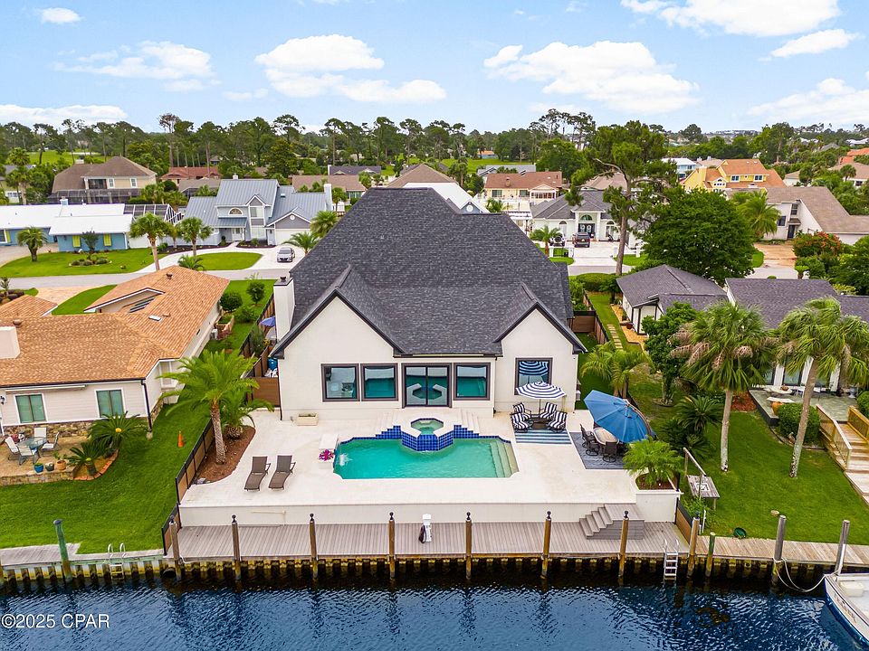 Private dockComposite deckingSaltwater pool and spaCanal-front estateWaterfall-edge quartz countersWide-plank white oak flooringLed-lit spillway