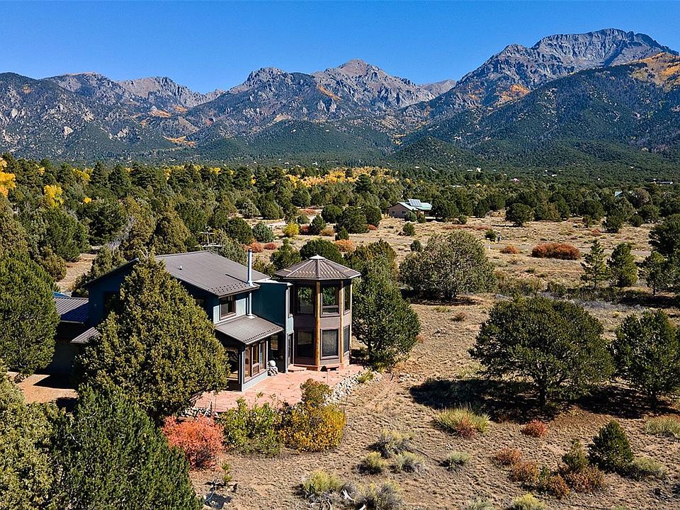 Escape to a world of peace & natural beauty in this idyllic mountain retreat, cozy & bathed in light, w/ endless views from every room. Nestled privately on 6+ acres of pinon-juniper woodland, a stone’s throw from Willow Creek greenbelt trails. Let the sounds of the gurgling creek wash over you and feel the stress melt away. The very best location at the heart of the Baca, where Chalets & trees meet Grants & flats - the views are panoramic. The Baca, famous for those views & unspoiled nature, has staffed firehouse, EMTs, parks, greenbelt trails, & rustic golf/tennis. Lots of extras w/ this 3BD/2BA 2-level contemporary build: 675sf 2-car garage, 2x6 framing, passive solar, screen porch/sunroom, bonus/flex rotunda, hydronic in-floor heat, solar hot water, oak/tile/concrete floors, custom stone & masonry hearth + hewn mantle, exposed beams, Spanish plaster walls, arched doorways, large & plentiful glazing, wraparound flagstone terrace, 100s of windbreak bushes/trees...& much more. Easily unload groceries from garage to kitchen, featuring LP range, block counters & custom wood cabinets. Dine in front of oversized windows or al fresco on screen porch. Curl up in front of hearth on cold winter evenings. Full bath w/ tiled soak tub & walk-in shower. Main floor bedroom doubles as den. 2 Pantries. Upper level has another full bath w/ dbl vanity & valley views. 2 large bedrooms w/ oak floors, either can be primary. Study nook. And the incredible tower, designed by David Yarbrough accordingly to sacred geometry – perfect for art, teaching, yoga, music, etc. Low maintenance stucco exterior & metal roof. Generator. Pvt well & septic (save on H2O bills/taxes). 10 min on paved roads to town & amenities. Crestone is famous for sunny days, accredited dark skies, 2 local schools, burgeoning community & small-town vibe. Access to hot springs, skiing, climbing, riding, fishing, MTB & more. Ready to quit the hustle & bustle? Call today to tour this gem - your mountain refuge awaits.