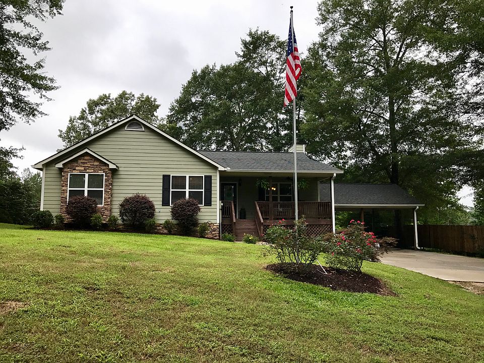 Welcome to the Friendly City! This adorable craftsman-style home is on 3.05 acres & the large, covered back porch overlooks the almost 2-acre pond (fed by a natural spring). You'll love the natural open flow as soon as you walk in the front door. The living room, dining room, and kitchen all tie in together. In the living room, you'll find built-in bookshelves and a beautiful rock fireplace. There are stainless steel appliances (and all of them stay) and a brand new hot water heater. There is real hardwood flooring throughout the main living area, bedrooms, and real tile flooring in the 2 large bathrooms. One of the bathrooms features a double vanity and a shower/tub. The other bathroom has a large tiled shower. Outside is an attached 2 car carport and a perfect front porch for sipping sweet tea and enjoying the beautiful view of your long driveway lined by fencing and stunning farmland