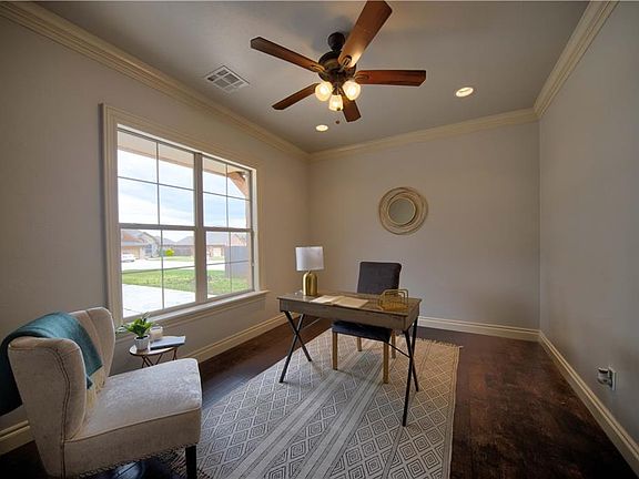 Great home built by Doyle O'Hagan. Stunning entry way, with study just off the entry, Open concept living. Dining and kitchen, hand scraped wood floor in the living room, beautiful tile entry and kitchen/dining area. Granite countertop with island breakfast bar and sink. One will never be left alone in the kitchen unless they prefer. Bedrooms have carpet. MLP plan. Super large covered patio. Side loading three car garage. All closets have built-ins. Master bathroom has roman shower, spa tub, tray ceilings. Great cabinetry in kitchen. Come show and see and it will sell! $1500 flooring allowance for master and 1 bedroom Frigidaire 30" Front control gas range to be installed as well with acceptable offer