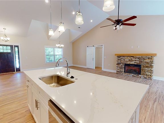 Stone-faced electric fireplace, quartz countertops, crown moulding, stainless kitchen appliances, ceiling fans, blinds. waterproof vinyl and tile on first floor, carpet and vinyl on second floor. Tile master shower with glass door. Master water closet. All closets have ample shelving; bedroom closets and pantry shelving is adjustable. 425 sf attic storage.