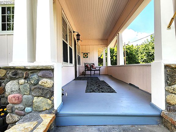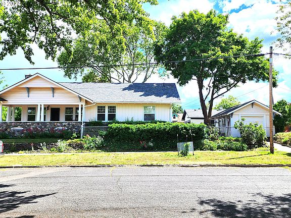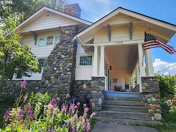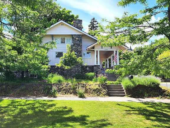 Striking 1920's 2-Story Craftsman set on a terraced corner lot amongst some of "old town" La Grande's finest homes. Much of the period details have been well preserved including the original interior woodwork and light fixtures. A glass daffodil chandelier by Cove artisan, Tom Dimond, graces the dining room ceiling. The grounds are an eclectic menagerie of xeriscape and raised beds with drip lines, perfect for the creative gardener. There is a detached, "mini Cooper" sized garage used mostly as a shop/storage building but could easily be a hobby hut or exercise escape. There are several productive (Bosc pear, heritage apple) fruit trees, berries and herb boxes. Inside you'll find exquisite original woodwork and wood framed beveled windows most of which open and have storm windows for insulation. The living room has a gas stove insert in the handsome, stone fireplace. The spacious, modern kitchen has a European type refrigerator and two refrigerated drawers as well as a professional work station and an exit to the fenced portion of the yard. You'll love down time on the generous, covered front porch where glimpses of the surrounding territory can be seen. The original, Craftsman built-ins add charm to the main floor office/bedroom as well as to the hallway and bathroom. The bathroom has a fully operational clawfoot tub and pedestal sink as well as a modern, heated bidet. Inside the built-in bathroom cabinet is a well placed laundry chute for domestic convenience until one can head to the basement where the laundry is done. There are clearly three and up to five bedrooms; three on the main floor (currently used as the primary room, a media room, and an office. Upstairs are two opposite end bedrooms separated by a large storage closet and a wash closet size bathroom. New carpet has been installed on the stairs leading to the second floor, plus the upstairs hallway and bedrooms. Recent upgrades include a gas water heater, security cameras, thermostat and furnace.