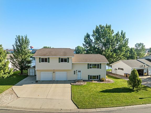 Looking for waterfront property in Minot? Look no further! This four bedroom, three bathroom split-level home with an attached two car garage is awaiting new owners. The exterior of the home features vinyl siding and a concrete driveway with a separate parking pad perfect for trailers or an RV. There is also a large shed available to store all of your outdoor equipment. There is a sprinkler system, fenced in yard, and a dock outside of the fence with access to the pond. When you enter the home, you are welcomed into the foyer. To the left is access to the two-car garage which is insulated and has floor drains. Up the stairs on the main level is the laundry room, living room, kitchen and dining areas. The kitchen appliances have been replaced in the last 2 years and there is an amazing view of the pond out the window above the sink. There is hard surface flooring throughout the main area. Up the stairs is the primary bedroom which features a walk in closet and an ensuite bathroom with a shower. There are two other bedrooms and a hallway full bath as well. The basement features an additional bedroom and secondary living space. The utility room is downstairs as well. Don't miss out on your opportunity for of the best views in town -- contact your preferred agent today to schedule a showing.