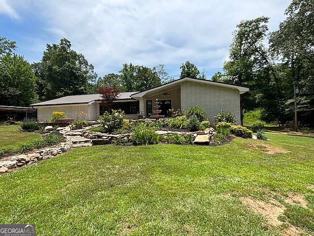 Welcome to your private oasis on a sprawling 10.73-acre estate in the tranquil heart of Western Coweta County. This meticulously maintained California Ranch-style home beautifully combines modern upgrades with the timeless charm of its era, offering a perfect retreat from the hustle and bustle of everyday life. With a full unfinished walkout basement, there are limitless possibilities for expansion-create a spacious office to meet clients, add more bedrooms and living areas, or design a recreation space with a game room or theater. Whether you're looking to start a home-based business in the expansive workshop or explore the property's abundant wildlife, this estate has it all. Bring your ATVs, farm animals, and dreams-your private paradise awaits. * With almost 2000 sf of living space on the main level, this spacious open concept plan features a large great room with new modern stone fireplace accented by custom built-ins. The living and dining areas are open to the beautifully renovated kitchen with abundant quartz countertops, new cabinetry, tile backsplash, and stainless appliances, all of which stay. Just off of the kitchen is a large pantry/mudroom with additional cabinetry and a large laundry room with washer and dryer remaining with the home. Beautiful engineered hardwood floors are throughout the living/dining/kitchen areas. Enjoy the amazing natural light that flows into all areas of the house from the many large plate windows and doors. The primary suite has sliding doors that open to the large private back patio and an en suite featuring a new vanity yet maintaining the mid-century style with the original vintage tile floors, tub/shower combo and a separate shower. The secondary bedrooms are both light and airy, one with carpet and one with new LVP flooring. The renovated hall bathroom features a double vanity and large oversized tile shower. Downstairs is a full unfinished walkout basement offering limitless possibilities! There is plenty of room for an additional living area and 2 bedrooms, and it is plumbed for a bathroom. Enjoy the tranquility of this amazing property from the covered front porch, or patio with firepit as you listen to the sounds of the custom water feature overlooking the country landscape, or from the large back patio with plenty of space for outdoor entertaining and grilling under the covered pavilion area. There is a fenced backyard for your furry friends as well. For the hobbyist, there is a 30x50 workshop with new metal roof and garage door, 100 amp electrical and there is water available. This workshop is also perfect for a home based business, as the property falls within the Coweta County guidelines for such. The shop is plumbed for a bath, however, it is not tied to a septic system. There is a 2 car attached garage as well as 24x60 covered canopy for vehicles or other equipment. WITH SPECTRUM HIGH SPEED INTERNET AND DELIVERY SERVICE AVAILABLE THROUGH KROGER AND UBER EATS, YOU WILL NEVER HAVE TO LEAVE YOUR OWN PERSONAL PARADISE!! NEW METAL ROOF, NEW GUTTERS, NEW MAINTENANCE FREE FASCIA & SOFFITS* COUNTY WATER AVAILABLE *Don't miss this rare opportunity to own a piece of paradise in western Coweta County. This beautifully renovated California Ranch awaits, offering an idyllic setting and endless possibilities for creating lasting memories.