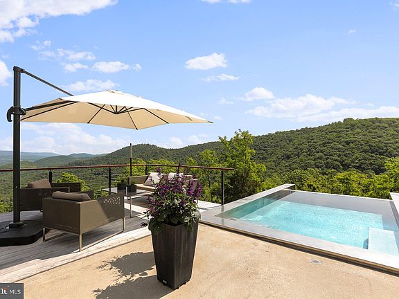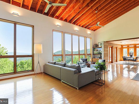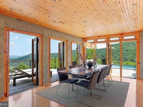 Located just two hours from the DC Metro area in the heart of the sought-after Lost River, this spectacular, architecturally significant home has an unmatched “mountain modern” aesthetic and was custom-built to exact specifications where no detail was overlooked. Perfectly sited on 6+ acres, this home features four bedrooms, two full baths and two half baths thoughtfully situated on three levels.  This home is completely turn-key and offered fully furnished.  The exterior architecture incorporates traditional tongue and groove cedar siding contrasted with organic board-formed concrete. This home is perfect for every purpose, the captivating, sweeping panoramic long-range mountaintop views create an idyllic atmosphere for spending quiet moments in peace, entertaining guests, and telework.   Upon entering the home through the 2-story foyer, the overwhelming, expansive view of the Lost River Valley and surrounding mountaintops are framed by two stories of floor-to-ceiling glass and windows. The great room with pine-clad soaring ceilings and exposed beams are filled with and anchored by a beautiful Rumford-style wood-burning fireplace. The dining room is surrounded by walls of full-glass French doors, and features hidden retractable screens, creating an indoor/outdoor dining room. Just outside the dining room, an unmatched atmosphere is created on the stunning elevated entertaining deck which has been artfully designed with a jaw-dropping stainless steel, heated, infinity-edge pool looking onto the panoramic valley views, integrated audio system, an outdoor gas fireplace and outdoor kitchen with integrated professional gas grill. All exterior decking is extremely dense Brazilian Ipe wood that is extremely long-lasting and naturally nearly maintenance-free.  A beautiful and functionally designed gourmet kitchen perfect for creating meals of any size features a very large center island with bar-height counter and seating, stainless steel countertops, a gas cooktop, a seamless built-in cabinet front refrigerator, and Gaggenau built-in coffee and espresso machine. The loft, ideal for telework, overlooks the great room, takes in all of the expansive views, and features a Juliet balcony overlooking the grounds and a half bath. This large space can also serve as an additional bedroom, den, or library.  An entire west-facing wing taking advantage of the vast views features the primary bedroom suite with an incredibly efficient wood-burning Rumford-style fireplace, large ensuite bath, walk-in closet, secluded outdoor shower surrounded by a natural rock waterfall, and private deck that is perfect for reading and meditation or afternoon naps in nature. The lower level features a wine cellar, a full bathroom with jetted Jacuzzi soaking tub, and three bedrooms each with views and direct outside access to a beautiful deck and the expansive lawn and meadow below. One bedroom is currently set up as a home gym. Also on this level a traditional Finnish sauna is perfect for post-workout.  There is also an existing art studio/workshop with a private exterior entrance and glass French doors that open to the view and lawn, it features a double sink and has already been rough-plumbed and can be easily converted into another bedroom with an ensuite bath.    This property is served by high-speed fiber optic internet and all underground utilities. Nearby entertainment & shopping - approximately one mile to the Guesthouse Lost River (on the same street) and within a few miles of nearby local markets, shops & businesses.  The Lost River State Park and George Washington National Forest just a few miles away feature thousands of acres of hiking trails, horseback riding, and more.  Visit the Virtual Tour & Video-Walkthrough links to see this incredible home!