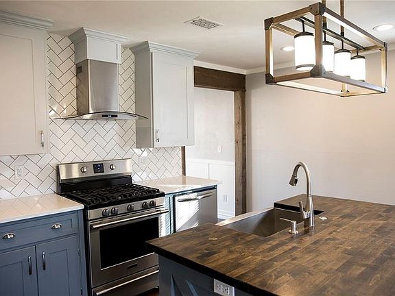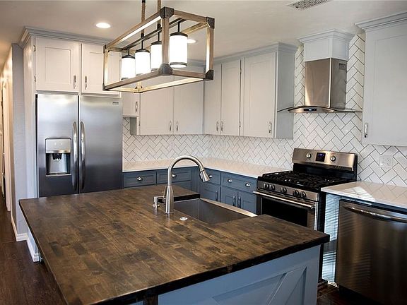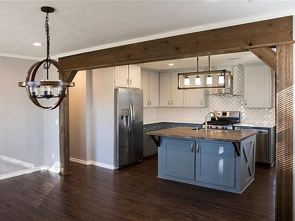 Beautifully updated home located 1 mile from Lake El Reno and walking distance to Adams Park. There are 3 bedrooms, 2 baths, 2 living areas, an extra-large laundry room, and a 15 x 32 all-steel workshop with a brand new FlatSafe storm shelter. The kitchen has quartz countertops, a stainless steel farmhouse sink, tons of storage space, and the sellers are leaving the stainless steel refrigerator. The flooring is a waterproof vinyl plank. The home has an ADT alarm system and an Arlo doorbell camera that is also staying.