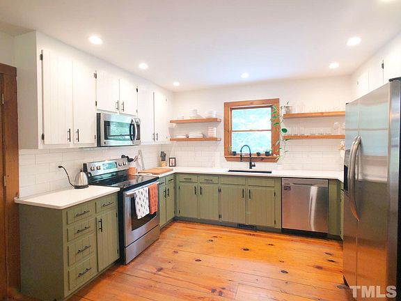 Charming farmhouse ranch with rocking chair front porch less than 30 minutes from Downtown Raleigh. Private acre lot located at the end of a cut-da-sac with fenced backyard. Rustic wide plank floors and trimmed with salvaged heart pine throughout. Renovated kitchen features Arabis White Quartz countertops, stainless appliances, granite sink and modern fixtures. Huge master suite with walk in closet, en-suite bathroom with dual vanities. 2 car garage with mud sink. Minutes from Aviator and Bass Lake Park.