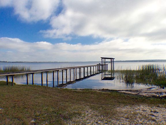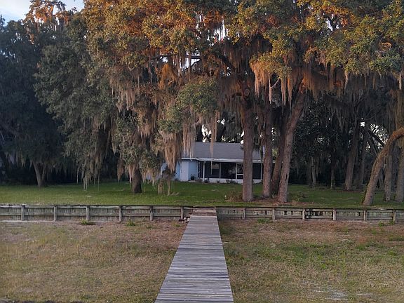 Sunsets and Sunrises can be enjoyed from this beautiful lakefront home location on the North end of Lake Kerr. As you enter the front door you notice the open floor plan with tongue and groove cedar from floor to ceiling in living room and brick accented wood burning fireplace. Lake views are visible through the oversized slider and windows in living room and main bedroom has large picture window. 1.06 acres is landscaped, irrigated and covered with huge oak trees and more. At the waters edge there is a bulkhead with long walkway leading to dock and powered boat lift. Lake Kerr is known for great fishing and some of calmest waterskiing and wake boarding found in Central Florida.