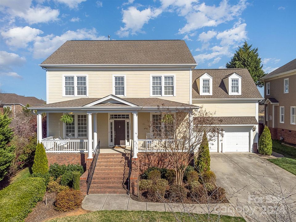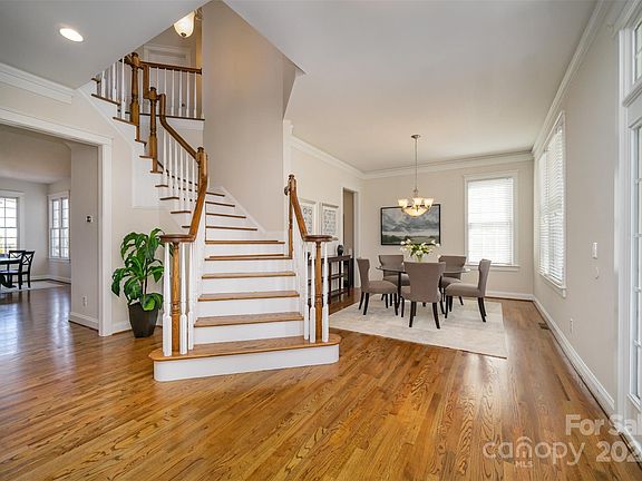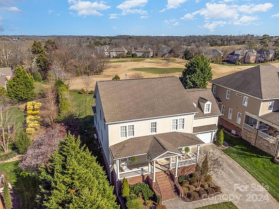 Inviting craftsman home rests atop a gentle hill affording beautiful sunrise views over the 13th green. Wide brick steps lead to covered front porch. Interior is bright & fresh with recently painted neutral wall color & refinished hardwood floors. Sweeping staircase, detailed craftsman millwork, high ceilings & large windows. Perfect open layout with spacious kitchen & large island for gathering. See-thru fireplace adds warmth in both great room & sunroom. Upstairs primary suite offers trey ceiling, walk-in closet with built-in organizers, & spacious primary bath. Bonus room is outfitted with surround sound wiring, great for movies & games. Rear deck might be the best “room” in the house! Expanded deck has covered lounge area, space for dining, & built-in fire pit. Stone pad & wiring already in place for a hot tub to be added. Wide backyard with mature landscaping has perfect balance of golf course views & privacy. Skybrook is one of N. Charlotte’s premier semi-private golf courses.