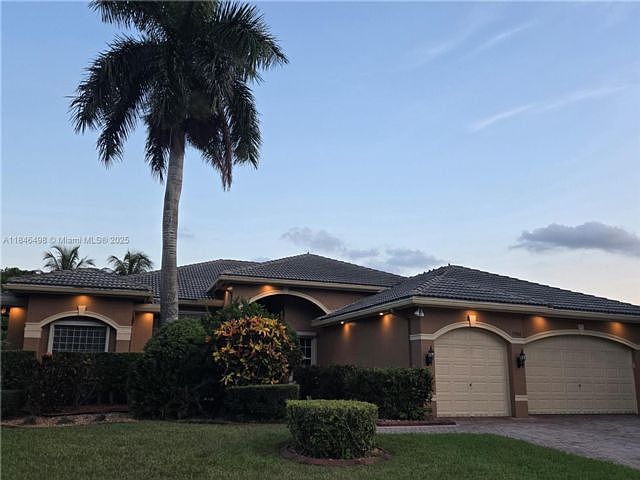 Riverstone Community is one of the most luxurious waterfront communities in Davie. This Mediterranean style home has a lake view backyard with tropical landscaping. 24 hour guard at gate. Riverstone features a recreational pavilion. Tennis and picket ball courts, full basketball court, and several walking paths. This beautiful home with split floor plan has a gourmet kitchen. Formal dining room. Large Florida room. Spacious office/bedroom. Master bedroom with large bathroom and his and hers closets. Laundry room. Three car garage. Easy to view and fast HOA approval. Available to move in.Courtesy of Nizz Realty Inc (Listing 3311648 Confirmed 8/28/2025)
