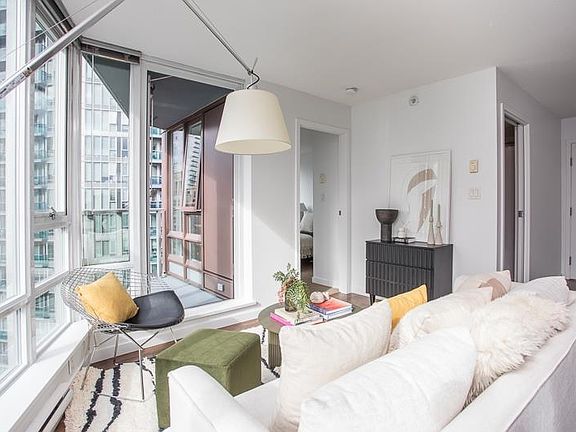 Experience a bright open 1 bedroom and den floor plan at TV Towers II by Concord featuring a stunning wall of floor-to-ceiling windows, offering views of False Creek and flooding the space with natural sunlight. This home is designed for both comfort and functionality, boasting a versatile flex room, an inviting flow from the living area to the balcony, and a spacious bedroom. Perfect for modern living, this incredible value property truly has it all! The building features a sauna, hot tub, gym with yoga studio, party room with pool table and 24-hour concierge and security and is centrally located with shops, restaurants, grocery, transit and BC Place right at your doorstep. In-suite laundry, A/C, bike storage, 1 parking included.