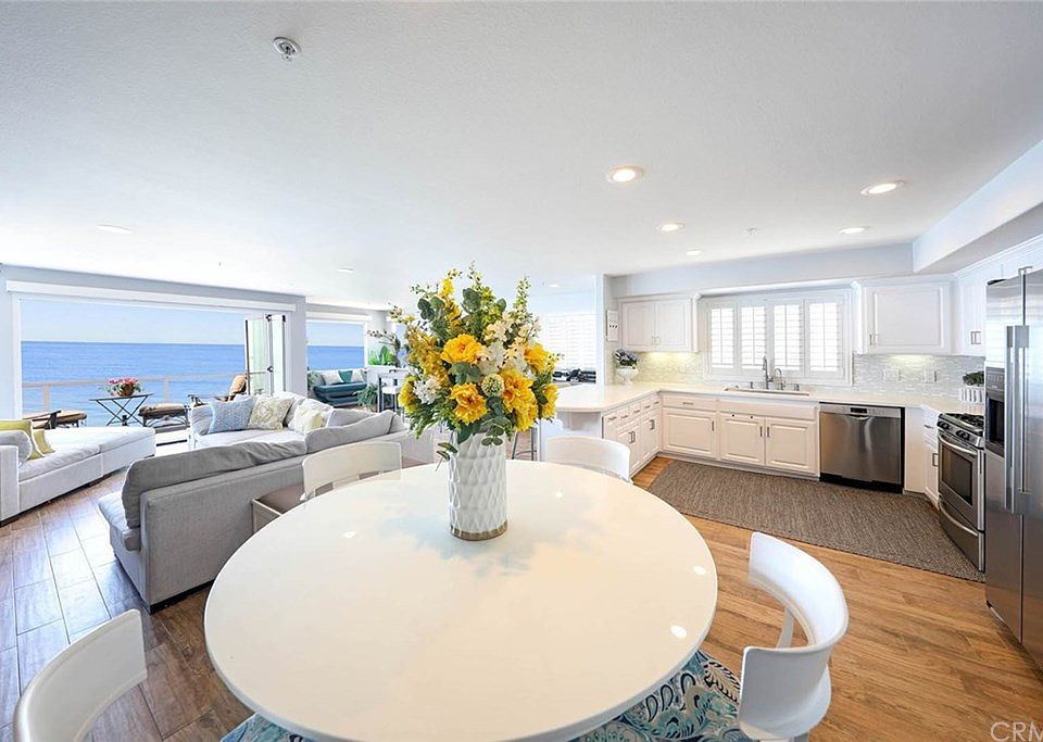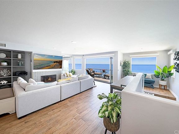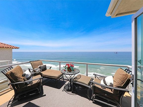 Ocean Front Penthouse Condo with exceptional views of the Coastline, Sandy Beaches, White Water, Catalina Island, Dana Point and the most Romantic Sunsets. This stunning property has been recently upgraded throughout and feels like new. Features include Cantina Trifold doors opening the living space to the Ocean, a remodeled white kitchen by Reborn with Quartz countertops, glass tile backsplash, an enlarged kitchen peninsula with breakfast bar, new Bosch dishwasher, porcelain tile wood tone flooring, Tankless Water Heater, new paint, new carpet, custom blinds with remote programming, glass fireplace surround with beveled glass doors, two fireplaces, Air Conditioning, inside laundry area with full size washer & dryer included, new LED lights, a rare private 2 car garage with new built in cabinetry and a 2 car driveway, private storage, soft water filtration system, an outdoor shower and a sunny balcony for enjoying this amazing view, Coastal Breezes and the San Clemente lifestyle. The floor plan has two master bedroom suites, both with spacious walk in closets, plantation shutters and dual sinks. The unit has a front and back staircase leading to the condo for convenience. Situated on the bluff above the popular '204' surf spot and is a few doors to beach access. Watch fireworks, walk on the beach trail and a short distance to the Pier, Shops, Restaurants and Ocean Festivals. Pets are allowed. Only 4 units in this well cared for building. Furnishings can be sold separately.
