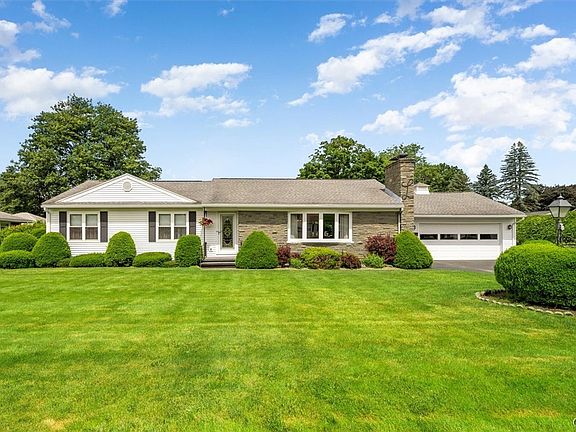 This IMMACULATELY maintained RANCH epitomizes the essence of a time where tradition & comfort were everything! As you approach, pride of ownership is evident in the manicured landscaping & charming stone accents. Situated on a DOUBLE LOT, this residence offers outdoor space for relaxation & entertainment, including a roof-covered shaded area, inviting in-ground pool w/slide, barbecue area, Summer garden area and storage shed. Step inside to discover an interior that is both open and inviting. The living room & dining room combination exudes warmth, and the adjoining family room provides additional space . Hardwood flooring lies beneath the carpeting in the bedrooms and hallway waiting to be revealed & restored! A wide staircase from the kitchen opens to the basement area where nostalgia awaits! This well-thought-out party area is complete with a fireplace, sitting area, bar, a small kitchenette & STORAGE. A highlight of this home is the expansive 3-season sunroom, providing the perfect setting for entertaining . Additional features of this exceptional property include LOCATION, CENTRAL AIR, newer roof and windows (ensuring peace of mind for years), and low taxes!