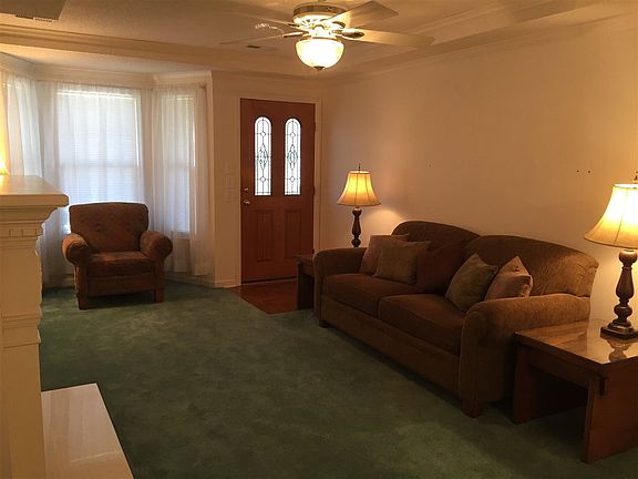 - LIVING ROOM DESC: Carpet, Fireplace, Crown Mold, Ceiling Fan, Bay WDW, Trey