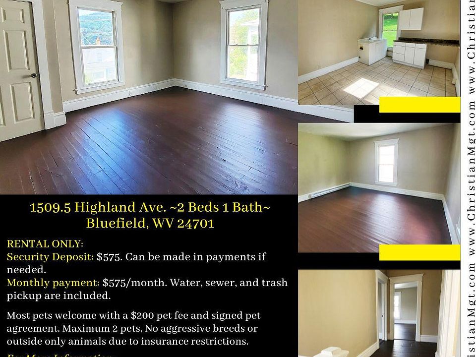 1509.5 Highland Ave. ~2 Beds 1 Bath~ Bluefield, WV 24701 RENTAL ONLY: Security Deposit: $575. Can be made in payments if needed. Monthly payment: $575/month. Water, sewer, and trash pickup are included. This newly updated two bedroom one bath duplex features a large covered front porch, new steps, fresh paint, bright spacious rooms, shared fenced in back yard, baseboard heat, high ceilings, driveway and street parking available, and includes water, sewer and trash pickup! Furnished with Stove & Fridge. Christian Management Corporation Office Hours: M-F 9am-5pm & 10am-2pm the 1st Saturday of every month You can view THIS property 7 days a week! Most pets welcome with a $200 pet fee and signed pet agreement. Maximum 2 pets. No aggressive breeds or outside only animals due to insurance restrictions. Clean, safe, quiet, crime & drug free is our goal. We Support Equal Housing Opportunities! Good people with good, bad, low, or no credit but stable employment or Social Security are welcome. Criminal Checks: -NO recent felonies in the last 7 years -NO evictions in the last 7 years -NO sex offenders Is this property not what you are looking for? ChristianMgt.com.