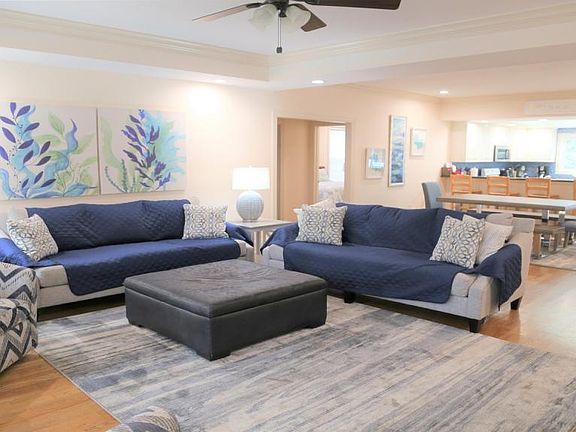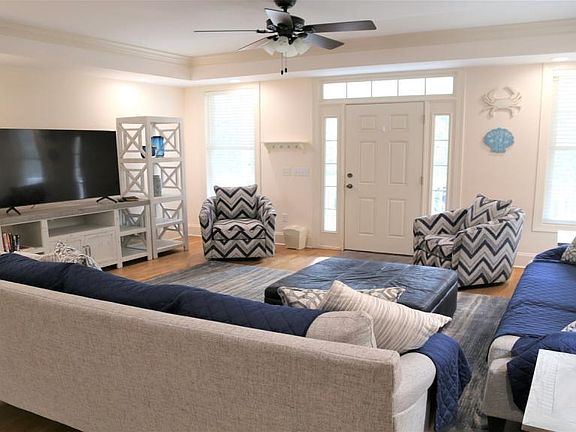 Custom 6 Bedrooms, 6 Bath home tucked away on quiet side street just a stones throw to the beach. Over 3400 sq ft with 2 large living areas, 9ft ceilings. First floor has 4 bedrooms, 4 bath, large living area, kitchen/dining, nice covered porch on front and sundeck on back. 2nd floor has large game room/great room with 2 bedrooms. One has 2 double bunk beds for kids and pull out bed in sofa and King bed in second bedroom upstairs. Great for beach memories and entertaining with outside deck off of living area. Fully equipped and furnished. Large area under house with storage, showers & cookout area. Fenced in backyard and great lot with nice trees close to beach and direct access down Marianne St. Also has an outside lift with ramp and brick walkway easy for wheelchair access and pets.