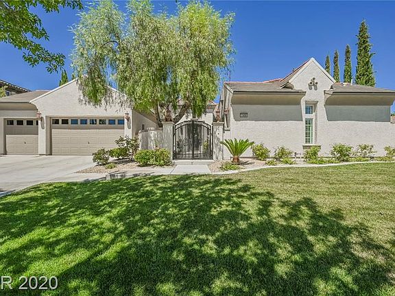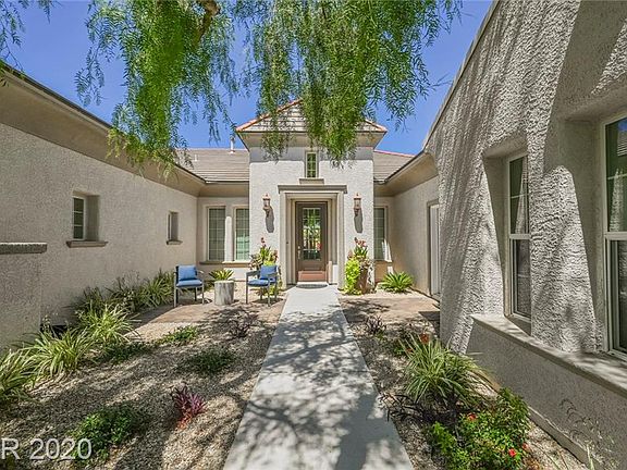 This unique home on an almost half-acre lot in The Vineyards area of Summerlin is as fresh and refreshing as the street on which it's located. Delightfully understated interior spaces open to a soul-soothing exterior featuring multiple covered and open-air seating areas. A manicured lawn radiates off the sparkling pool deck, providing a sea of green. There is even a comfortable outdoor den complete with fireplace, and a shaded dining space near the built-in grilling station. The home's master suite opens directly to the outdoors and is complemented by an opulent spa bathroom and dual walk-in closets. Two additional bedrooms share a full bath, and a convenient powder room serves guests. The kitchen, with gleaming stainless steel appliances, dramatic black cabinetry and grey-veined solid surface counters is a chef's dream. The family room boasts a sleek fireplace wall as well as a bar counter, and a separate den/library serves as a family retreat.