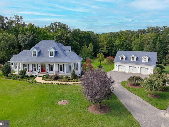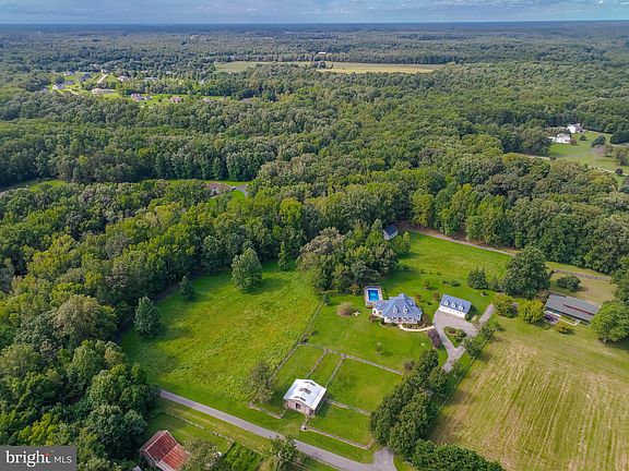 Beautiful farm on over 10 acres complete with a gorgeous 5 bed 4.5 bath country house with wrap-around front porch, detached oversized 3 car garage, and 4 stall center aisle horse barn with tack room. An additional 30x40 drive-through pole barn/workshop, 3 pastures with water, a pond stocked with bass & blue gill as well as perennials and ornamental shrubs designed for year around color round out this dream property. Savor your privacy and breathtaking pastoral views from your three season porch or swim on balmy summer days in your in ground pool, complete with pump house. This home boasts a spacious main level primary suite with sitting area, 2 walk-in closets, private access to side porch or deck and ensuite with 2 vanities, double shower, jetted tub and cabinets for storage. The kitchen has granite and stainless steel countertops plus 19 foot long granite bar that makes it perfect for hosting and is open to family room with fireplace and breakfast area with big windows and French doors. Additional features included are a dual sided gas fireplace between the sunroom and living room, central vacuum, wired connection for your backup generator, fire suppression sprinkler system, 1600 sq ft finished walk out basement downstairs complete with bedroom, full bath and kitchenette - perfect for in-law suite, and so much more. This home has oak hardwood flooring in the living room, dining room and primary bedroom. Ceramic tile floors are found in the sunroom, primary bathroom, powder room, kitchenette, downstairs bathroom and hall leading from patio/pool area. There is new carpeting in upstairs bedrooms, guest room and downstairs office/ craft room. LVP recently installed in kitchen, upstairs bathrooms and downstairs media/exercise room. Enjoy camping or hosting family or friends who do? RV connections are available at the house or barn. Horse owners will love having Oak Ridge park 3 miles away, Maxwell Hall horse park only 8 miles away, and their own fields for growing hay. Work remotely from your bright 12 x 30 office over garage with custom made yellow pine flooring & dedicated HVAC OR commute to DC, local hospitals, Pax River, Andrews or Dahlgren. A must see!