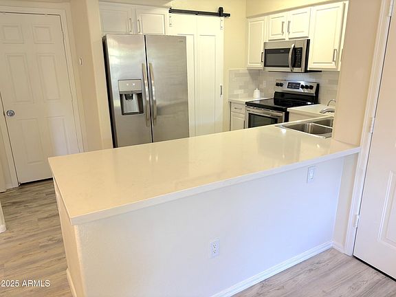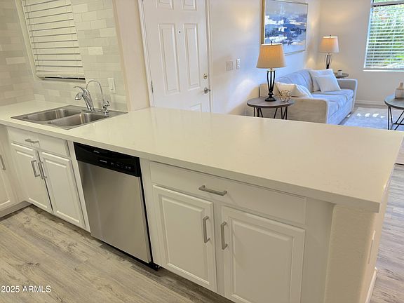 Beautifully updated ground-level condo in a resort-style community in the heart of North Scottsdale! Just minutes from the 101 Highway, this home offers unmatched convenience with easy access to top grocery stores and pharmacies. This 1 bed, 1 bath condo boasts fresh paint, updated flooring, and modern upgrades, including a kitchen island, sleek bathroom vanity, bi-fold barn doors for the kitchen/laundry, a new dishwasher, and a cozy fireplace. New ceiling lights add a bright touch, while the remodeled shower features a luxurious LED Shower Panel Tower System and frameless sliding self-closing glass doors for everyday elegance. The open-concept layout and stylish furnishings make this home truly move-in ready. Relax on your patio with mountain views or enjoy resort-style amenities