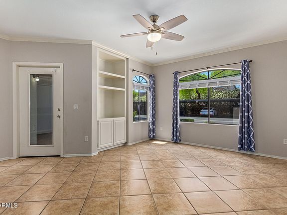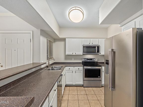 Short Term rentals allowed. 2.3 Miles to Westworld for Waste Mgmt Golf, Barrett Jackson, & Arabian Horse Show. Right by Loop 101 & Shopping close. Interior is adorned w/tile floors, a neutral palette, living room, complete with layered crown molding & inviting wall niches, sets the stage for cozy gatherings. The kitchen boasts white cabinets, stainless steel appliances (new dishwasher), pantry, & a peninsula w/a breakfast bar, perfect for casual dining. Large main bedroom offers direct patio access, a closet. Additional highlights include a storage room and a covered patio, ideal for enjoying Arizona's beautiful weather. Take advantage of the community amenities, including refreshing pool, spa, clubhouse, gym, steam room, dry sauna, BBQ's. & putting green! Agent related to seller
