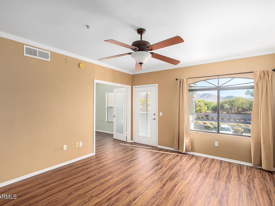 Beautiful mountain views from 2 balconies. Lovely 2 bed, 1 bath apartment unit now for sale in the Community of Signature at Scottsdale Horizon! Spacious dining & living room featuring elegant wood-look flooring, crown moulding, and warm palette throughout. The kitchen is equipped w/everything you need for home cooking, ample cabinet & counter space, track lighting, stainless steel appliances, and a lovely breakfast bar. The primary bedroom boasts soft carpet, private balcony access, a walk-in closet, and a fireplace to keep you warm during the coming winter months. Enjoy wonderful mountain views and a refreshing Community pool!