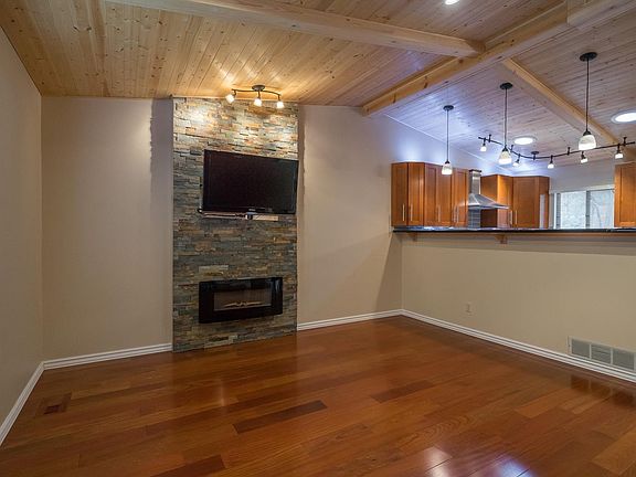 This spectacular 4-level home is nestled in the woods on a quiet cul-de-sac. It is located in D-20 school district. Stepping into the home, the first thing you will notice is the beautiful wood floors and spacious Living room. There is a stunning rock wall with electric fireplace and flat screen TV. The galley Kitchen has been updated with under counter bar and cabinet lighting, tile back splash and beautiful cabinets. The Dining area has a walk-out to the back deck. It's perfect for entertaining! Moving to the lower level, you will find a large Family room with wood-burning fireplace. On the upper level, you will find all 3 bedrooms and the laundry area. The Master Suite is quite large with tall vaulted ceilings. It has a large closet too! The Master bathroom is simply luxurious with a large spa shower, updated glass bowl-sink and fixtures. The upper level is also home to another full bathroom for the other two bedrooms to share. The basement is