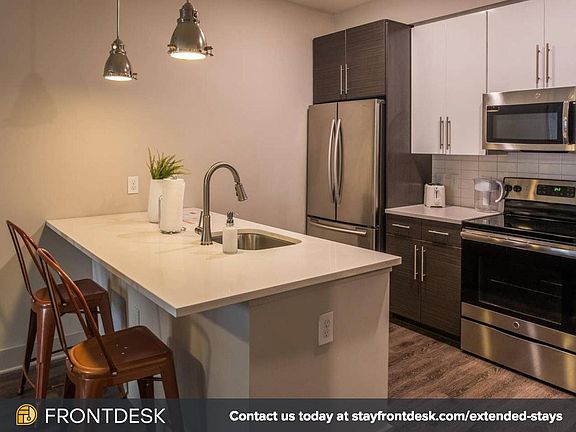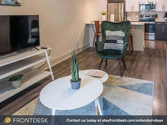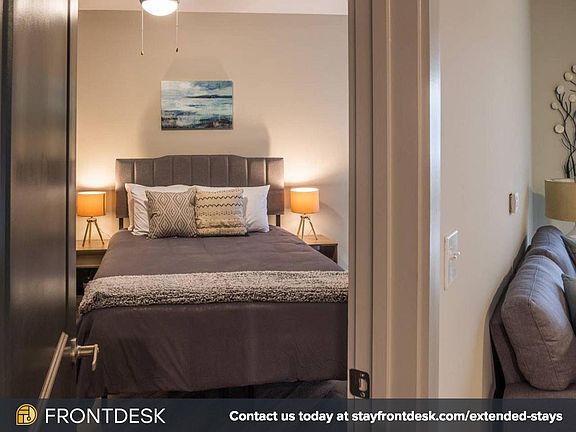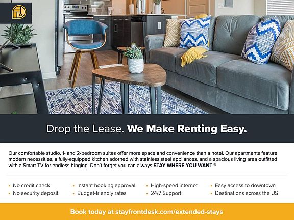 Check-in with Frontdesk. Our comfortable, fully-furnished studio, one-, and two-bedroom suites offer all the comfort of home and more! Get instant booking approval and enjoy budget-friendly rates at destinations across the United States. Discover renting made easy: flexible month-to-month reservations, no credit check, $0 security deposit, and our best price promise. Our friendly teams are available for support 24/7, and our personalized suites are designed for comfort by travel experts. Experience modern amenities during your stay like high-speed WiFi, a fully-equipped kitchen with stainless steel appliances, spacious living areas with a SMART TV for endless streaming, and quick access to public transportation. When you stay with Frontdesk, you're close to all the action in the city! Book your suite today and take a journey worth seeking.
