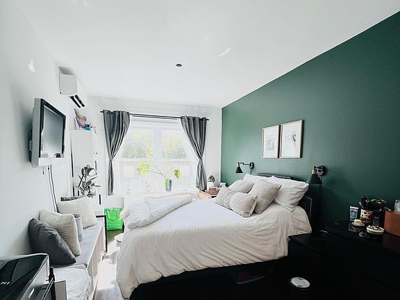 7-minute walk to the path station, elevator building, in-building laundry, and gorgeous space... What more can you ask for? This is a one-bedroom, top-floor apartment with large skylights, a view of the freedom tower, and a very large bedroom. The kitchen is updated with a 36" wide refrigerator, electric stovetop, and plenty of storage. The well-maintained building has a double door, gated entrance with a camera in the lobby, so you never need to worry about packages being stolen. You'll only be one block from the bustling Washington St. while also having the benefit of not hearing any street noises! There is a ductless AC and heater unit which can be accessed through your phone. Come see the space asap because this won't last long! Water and trash disposal is included, but all other bills will be paid for by the renter (i.e. electricity, internet, cable, etc.). No smoking/vaping is allowed. One parking space can be registered through the township and paid for by the renter. Small and medium-sized dogs and cats are allowed.