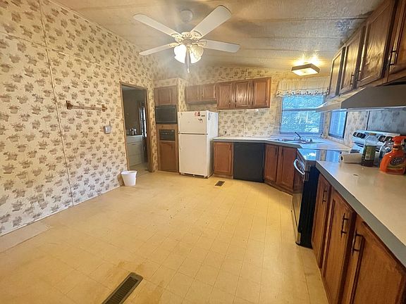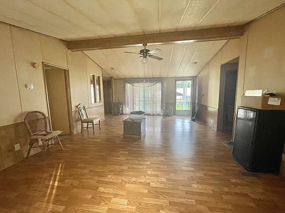 Just outside the town limits of Cedar Bluff, this 3 BR, 2 BA Clayton doublewide home is situated on a large level lot with a 3 car detached garage (with an office), a detached carport, a large paved area, and fenced yard. This home is 36 years old and needs some updating and repairs. Layout of the house separates the primary bedroom and bath from the other two bedrooms and bath by the main living area. There is a formal dining area as well as a eat in kitchen area. The home also offers a large living room area. Property is being sold AS IS to settle an estate. Property borders Indian Creek in the back and is in a flood zone.