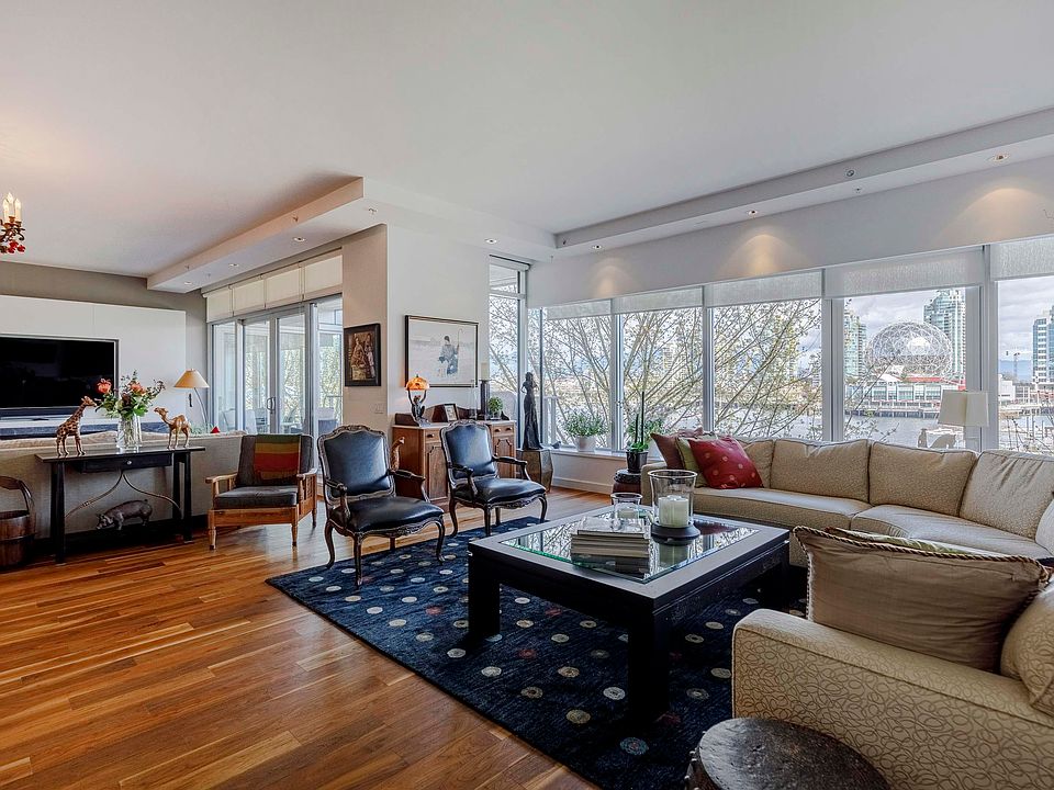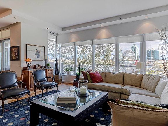Come home to Canada House! An EXCEPTIONAL WATERFRONT opportunity at OLYMPIC VILLAGE. Views to Science World, ocean and mountains complete this extremely private home. Canada House was inspired by Arthur Erickson, an elegant marriage of glass, steel, water and stone. The living space in this 2 bed plus large den, 2.5 bath residence are luminous and modern with top of the line finishes. Large bedrooms and a gorgeous open living, dining kitchen area with contemporary built-ins and up-grades. Owners have added a built-in modern office in the den that could serve as an extra sleeping space for guests. Private 2 car GARAGE with large storage locker, 24-hour concierge, library, lounge and gym complete this iconic residence. Access to Gold club POOL and countless amenities included.