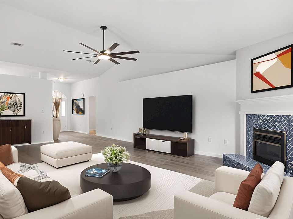 Upon entering this beautiful split bedroom floor plan home, you are met with the vaulted ceiling great room which contains an electric fireplace with impressive tile work.
