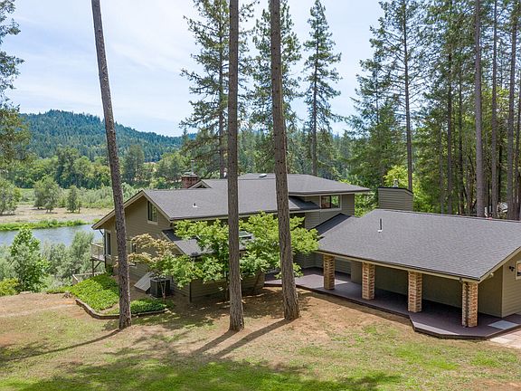 All of this exquisite home has been redesigned and updated. There are sounds of the river from every room creating a tranquil and peaceful setting to enjoy. The architectural design of this home, 4,363 sq ft on 3.79 acres, creates feelings of airy openness at the edge of the world. Main level offers open concept kitchen featuring built-in appliances, quartz counters, a large island and ample storage. Living space boasts 2 fireplaces and bonus room for entertaining. Private master suite features custom tile shower, soaking tub and expansive walk-in master closet. Top level shows 3 large bedrooms, 1 full bath with massive windows and sweeping river and landscaping views. Lower level provides a separate bed and bath, living room, wet bar, and fireplace. This property offers ample room for a shop or guest house. Situated on the Wild and Scenic Section of the Rogue with an island to go fishing, swimming or simply relax