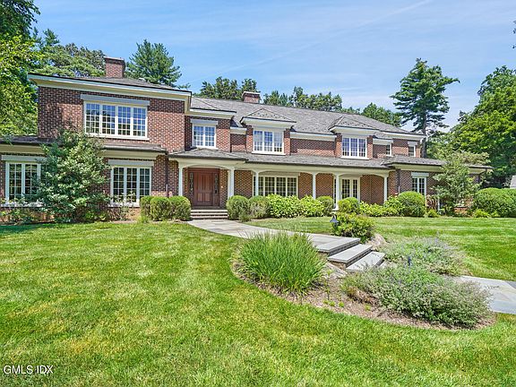 Stately brick colonial in a prime Greenwich mid country location, set at the highest point of a parklike 2+ acre property overlooking a majestic pond. Spacious center hall floor plan with 5-6 bedrooms, including a possible 1st floor guest suite. Quality custom craftsmanship including steel frame construction, slate roof, custom millwork plus top tier fixtures & finishes. Amenities include luxurious primary suite with fireplace, four 2nd floor guest bedrooms with ensuite bathrooms, paneled study with adjacent wine cellar, family room with vaulted ceilings plus adjacent sunroom with outdoor kitchen, chef's kitchen with large island & breakfast room, grand formal rooms with fireplaces, Butler's pantry, office, 3-car garage, custom pool with waterfall spa, pool house plus glorious property.