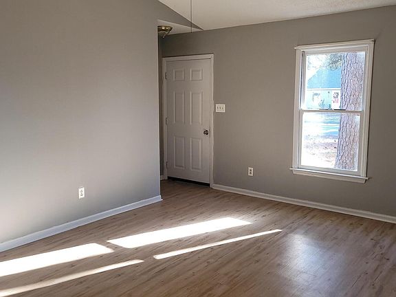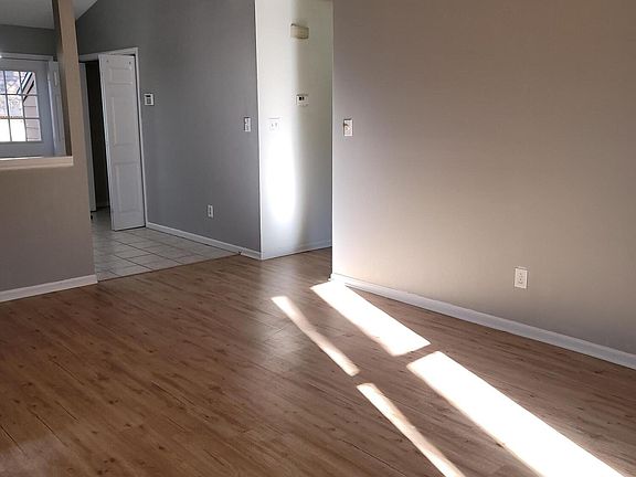 Freshly painted rooms with LVP/LVT floors in the living room and bedrooms. Kitchen and bathroom are tile. A large custom wall shelf in one of the bedrooms.